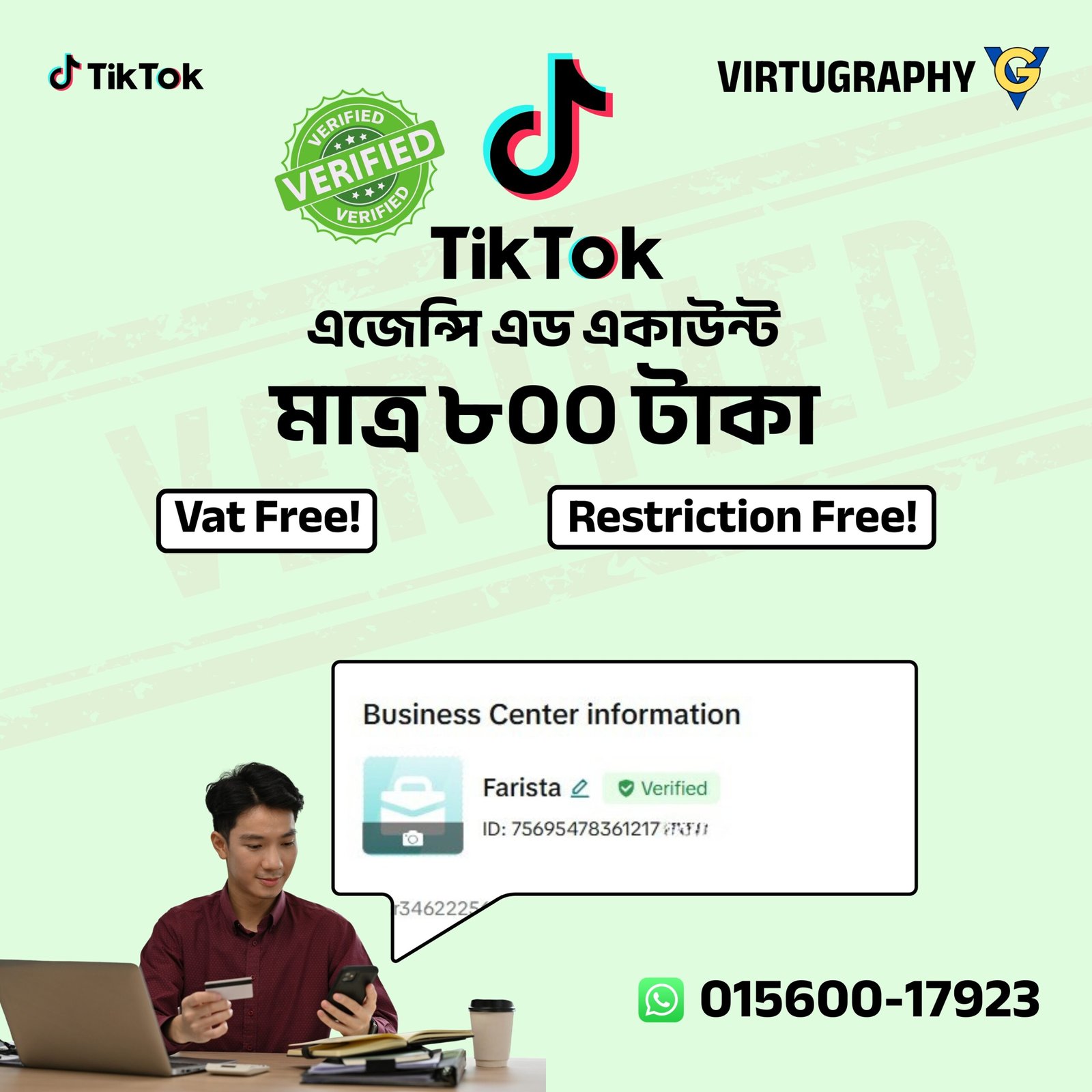 ​বর্তমান সময়ে TikTok মার্কেটিংয়ের অন্যতম সেরা প্ল্যাটফর্ম। Virtugraphy আপনার জন্য নিয়ে এসেছে TikTok ভেরিফাইড এজেন্সি অ্যাড অ্যাকাউন্ট, যা আপনার ব্যবসাকে ডিজিটাল মার্কেটিংয়ের পরবর্তী ধাপে নিয়ে যাবে। যেখানে অন্যান্য প্ল্যাটফর্মে বিজ্ঞাপনের খরচ দিন দিন বাড়ছে, সেখানে TikTok-এ আপনি খুব কম খরচে আপনার সঠিক গ্রাহকের কাছে পৌঁছাতে পারবেন।